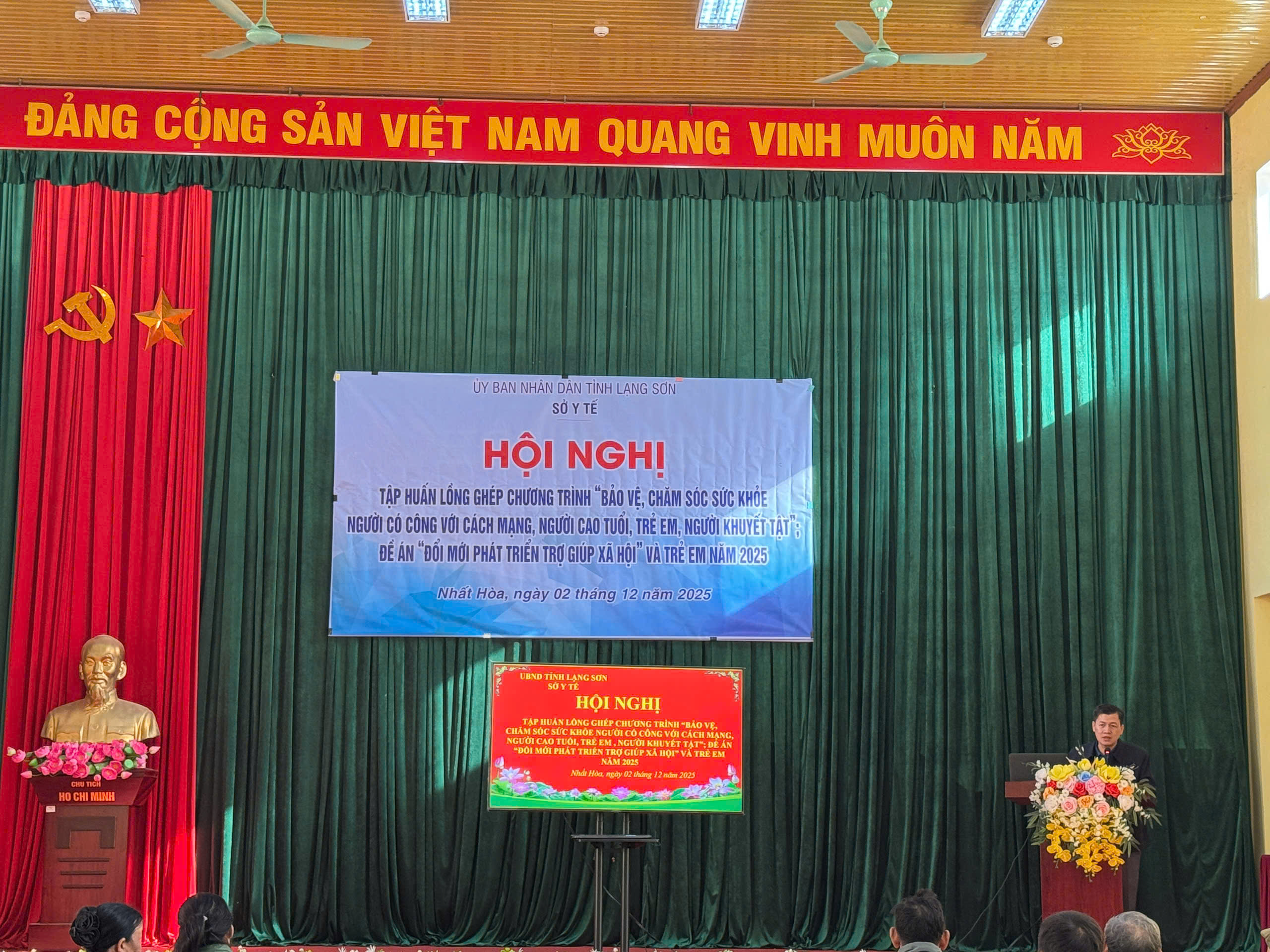 Sáng ngày 02/12/2025 Sở Y tế tỉnh Lạng Sơn phối hợp với UBND xã Nhất Hòa mở lớp tập huấn lồng ghép Chương trình “Bảo vệ, chăm sóc sức khỏe người có công với cách mạng, người cao tuổi, trẻ em, người khuyết tật”; Đề án “Đổi mới phát triển trợ giúp xã hội” và trẻ em năm 2025 tại xã. Tham gia lớp tập huấn có 100 đại biểu tham dự: gồm Công chức phòng Văn hóa – Xã hội; Viên chức thuộc Trạm y tế xã; Cộng tác viên làm công tác xã hội tại thôn (Bí thư Chi bộ, Trưởng thôn, Chi hội trưởng Phụ nữ); Đại diện các gia đình có đối tượng người có công, bảo trợ xã hội hoặc trực tiếp chăm sóc các đối tượng bảo trợ xã hội, khuyết tật, trẻ em.