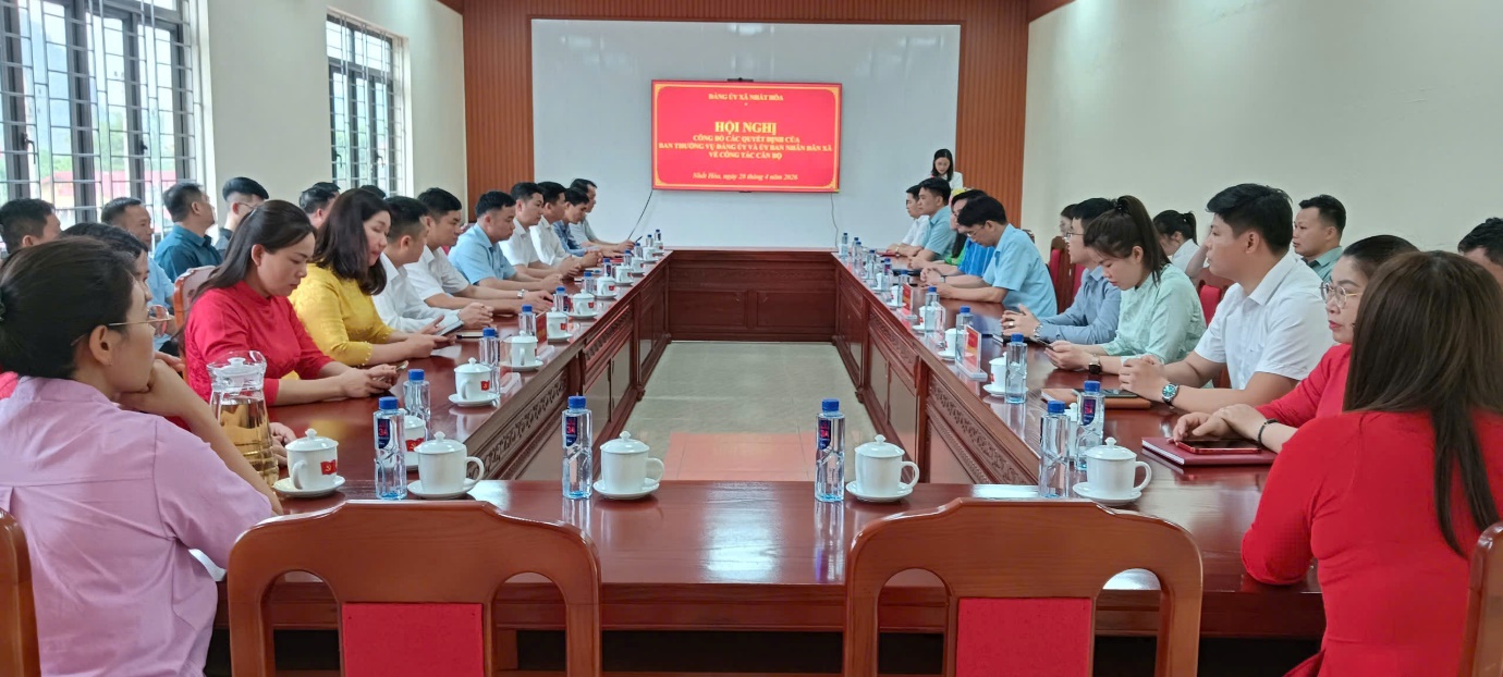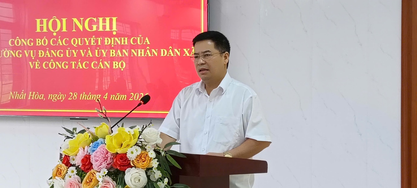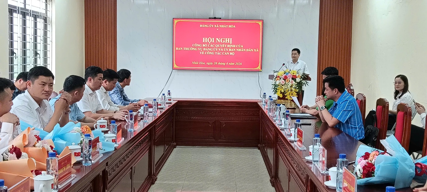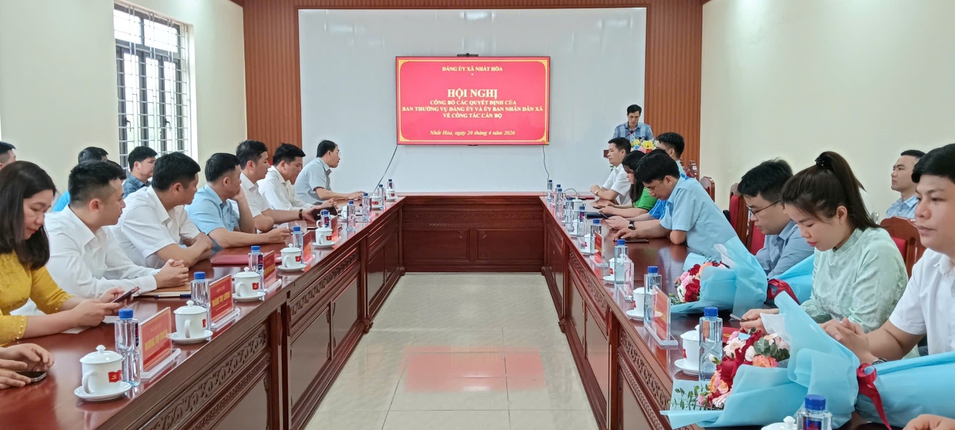 Ngày 28/4/2026, Ban Thường vụ Đảng ủy xã Nhất Hòa tổ chức Hội nghị công bố các quyết định về công tác cán bộ. Dự hội nghị có đồng chí Dương Xuân Văn – Bí thư Đảng ủy, Chủ tịch HĐND xã; đồng chí Lê Đức Thọ – Phó Bí thư Thường trực Đảng ủy; đồng chí Dương Hữu Phong – Phó Bí thư Đảng ủy, Chủ tịch UBND xã; cùng các đồng chí Ủy viên Ban Thường vụ Đảng ủy; lãnh đạo, công chức các cơ quan khối Đảng; lãnh đạo, công chức, viên chức các cơ quan chuyên môn và đơn vị sự nghiệp thuộc UBND xã.
