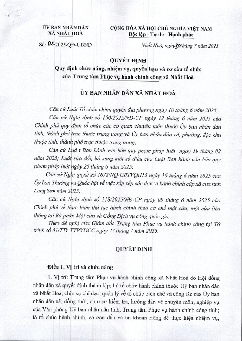 | Tiêu đề văn bản | Quyết định quy đinh chức năng, nhiệm vụ, quyền hạn, cơ cấu tổ chức của TTPVHCC xã Nhất Hòa | ||