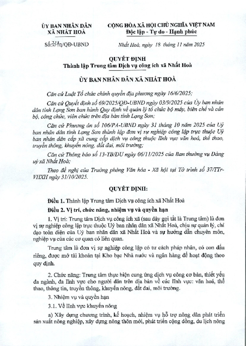 | Tiêu đề văn bản | Quyết định thành lập trung tâm Dịch vụ công ích xã Nhất Hòa | ||