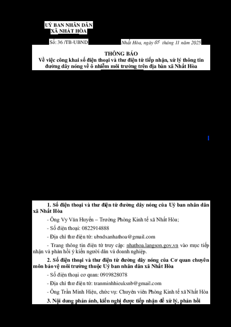 | Tiêu đề văn bản | Thông báo công khai đường dây nóng về Ô nhiễm môi trường xã Nhất Hòa | ||