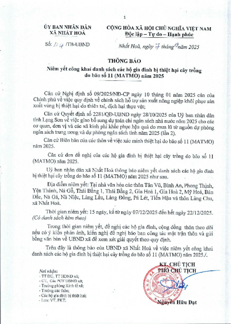 Tiêu đề văn bản Thông báo niêm yết công khai danh sách các hộ bị thiệt hại cây trồng do bão số 11 (MATMO) năm 2025
