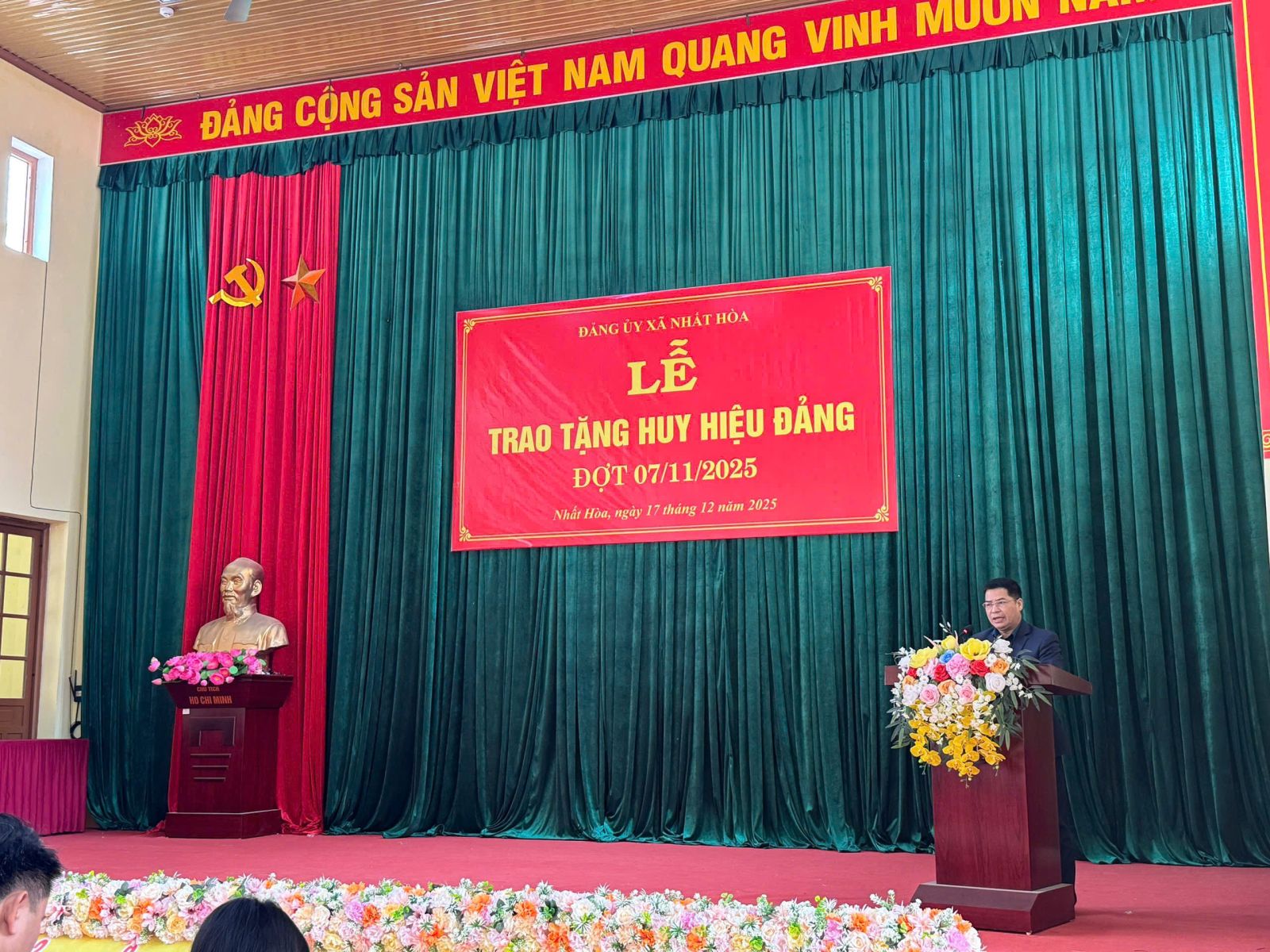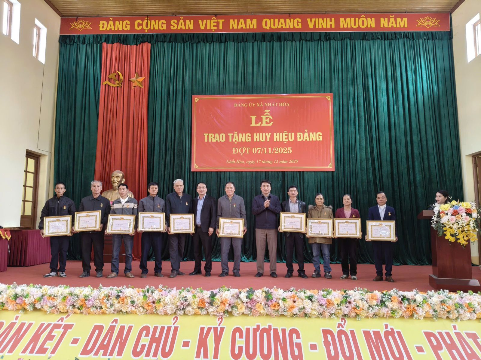 Sáng ngày 17/12/2025, tại Hội trường nhà văn hóa xã Nhất Hòa, Đảng ủy xã đã tổ chức Lễ trao tặng Huy hiệu Đảng cho các Đảng viên đang sinh hoạt tại các chi bộ trực thuộc. Đảng bộ xã Nhất Hòa gồm có 13 tổ chức cơ sở đảng, 21 chi bộ trực thuộc Đảng ủy xã, 03 chi bộ trực thuộc Đảng bộ cơ sở. Tổng số đảng viên toàn Đảng bộ xã là 860 đảng viên.